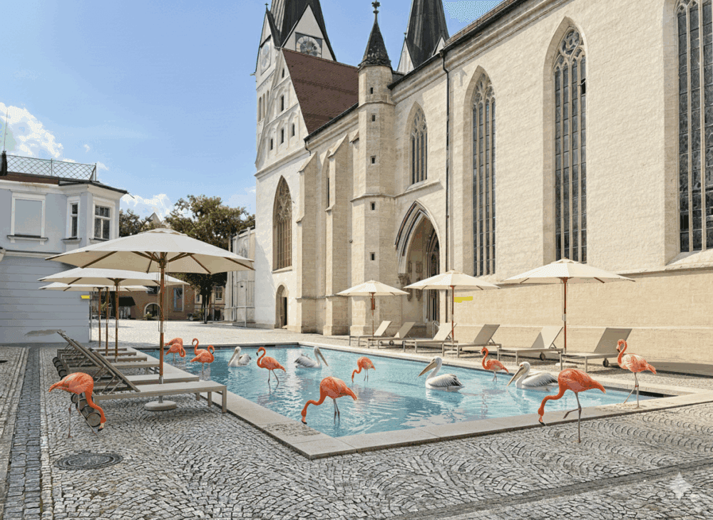 Dazu waren die EichstätterInnen über Flyer, Presse und über die Schaufenster der Ausstellungsräume aufgerufen in einer Umfrage ihre Assoziationen für „Eichstätts versiegelte Plätze 2034“ zu nennen. Über 95 Prozent der über 150 Teilnehmenden brachten ihren Willen zur Veränderung zum Ausdruck und wünschten sich auf einem oder mehreren Plätzen Entsiegelung. Dazu gingen über 200 Einzelideen ein, die direkt an die KI „verfüttert“ wurden. Diese generierte aus diesen Schlagworten fotorealistische Darstellungen der Eichstätter Plätze.